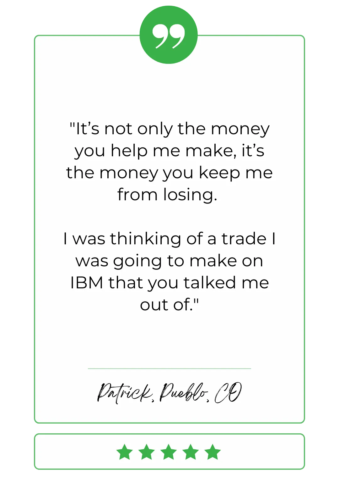"I am loving these credit spreads you have been putting out, I have had a great deal of success this month - thank you.….I was telling someone the other day, it is not only the money you help me make, it is also the money you keep me from losing. I was thinking of a trade I was going to make on IBM that you talked me out of."